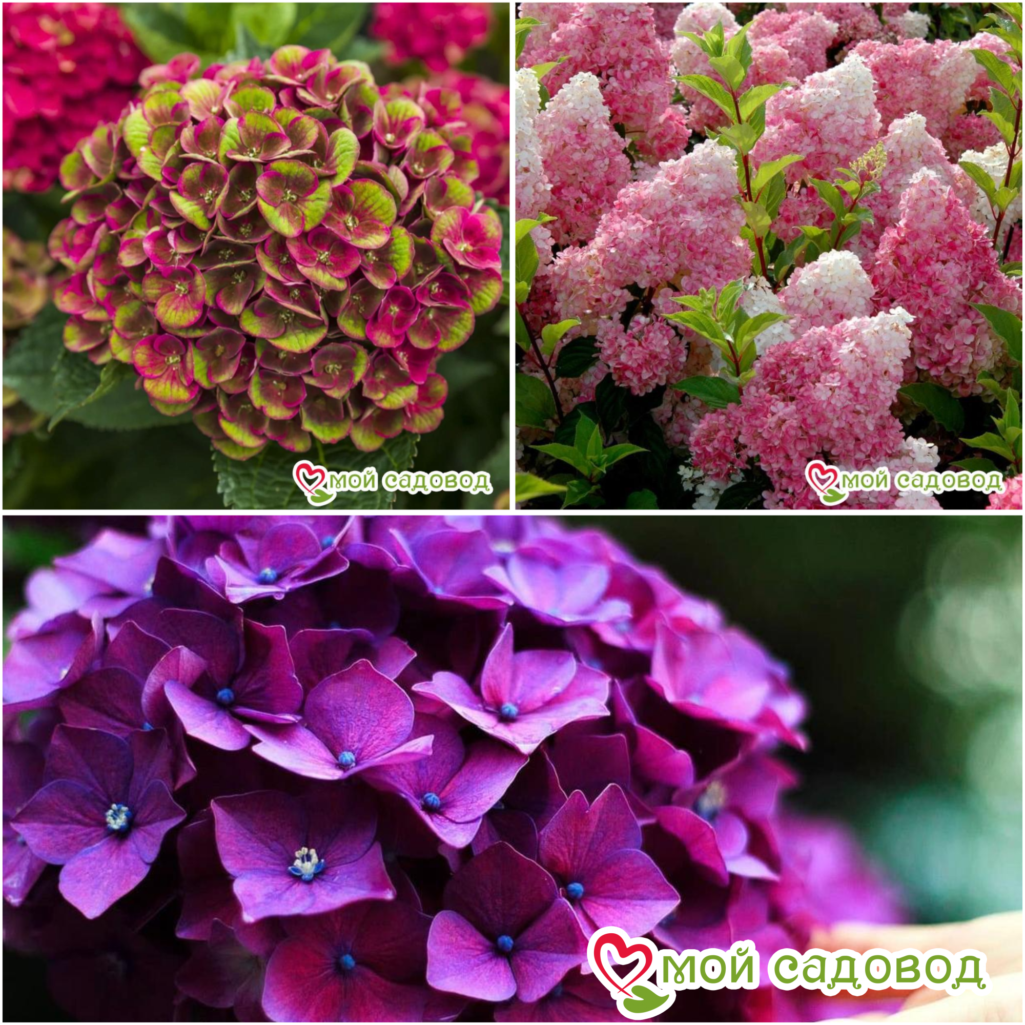 ГОРТЕНЗИЯ КРУПНОЛИСТНАЯ ФИОЛЕТОВАЯ — красивая разновидность гортензии, отличающаяся цветками яркого красно-фиолетового тона, с небольшим белым глазком в начале цветения. Цветение длительное с июля по октябрь. Высота растения 100-120 см. Листья темно-зеленые. На зиму требуется укрытие т.к. цветет на побегах прошлого года. ГОРТЕНЗИЯ ВАНИЛА ФРАЙЗ ЗКС — Стремительно и мгновенно завоевал сердца садоводов-любителей и ландшафтных дизайнеров. Это один из немногих сортов, который не нуждается в рекламе. Довольно высокорослый сорт, достигает 2 и более метров в высоту, с прямостоячими, жесткими побегами. Характерной особенностью этого сорта являются побеги интенсивно окрашенные в красный цвет. Листья темно-зеленые, сидят на черешках ярко-красного цвета, что придает особую декоративность. Обладает огромными, плотными соцветиями широкопирамидальной формы, с нижними боковыми выступами. На хорошем агрофоне высота конуса иногда достигает 40-50 см. Цветы  расположены по всему объему куста очень густым каскадом, сначала молочно-белые, затем нежнейшего розового оттенка, к концу цветения становятся насыщенно красными, почти вишневыми. Чувствителен к обрезке: величина соцветий сильно зависит от длины оставленных побегов. ГОРТЕНЗИЯ КРУПНОЛИСТНАЯ ЭНДЛЕСС САММЕР БЛАШИН — помпезный сорт крупнолистной гортензии, выведенный немецкими селекционерами совсем недавно в 2011 году. Куст компактный, с сильными стеблями, вырастает в высоту до 70-100 см.. Цветение роскошное соцветия-зонтики шаровидной формы, размером от 12 до 20 см в диаметре. Они состоят из маленьких стерильных цветков зеленого цвета, которые окружены чашелистиками яркого цвета. Данный сорт очаровывает трехцветными соцветиями. Розово-красные лепестки с желто-зелеными пятнами и привлекательный ярко-голубой центр не оставят равнодушными никого. Чем более кислая почва, тем более насыщенный голубой цвет. К концу цветения лепестки зеленеют. Листья заостренные, зубчатые, зелено-красного цвета. Побеги — одревесневшие однолетние. Цветение обильное и продолжительное с июля по сентябрь.